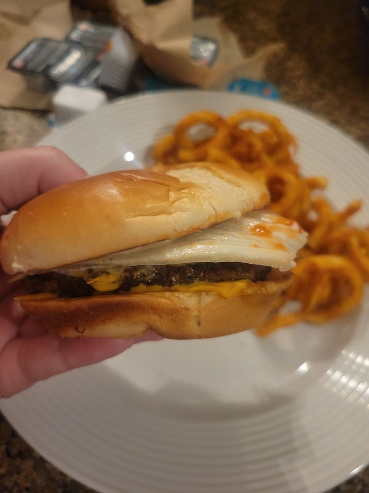 2x 100% beef seasoned as it grills, melty American & Swiss style cheeses, ketchup, mustard & mayo on a buttery bakery bun, plus fries & a drink.
